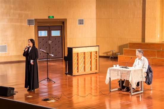 讲座由校党委副书记傅安洲教授开场致辞,国产成人综合网音乐表演系系主任张理副教授主持,国产成人综合网院长桂宇晖教授、邬海峰书记、校团委朱荆萨副书记等领导莅临现场。李光羲先生声情并茂地叙说了他歌唱生涯的特殊时代背景以及发展历程,同时由浅及深,对年轻一代的专业学习寄语良多。在讲座后半部分,李光羲先生对声乐专业的学生进行了具体的指导,指出了歌唱气息的技巧、歌唱情绪的运用等,而后唱响了当年的《祝酒歌》和流行歌曲《让我欢喜让我忧》,亲身示范了从技术到修养的完整呈现,迎得了长时间掌声无数次,其八十八岁高龄的艺术表演状态令人热泪盈眶。