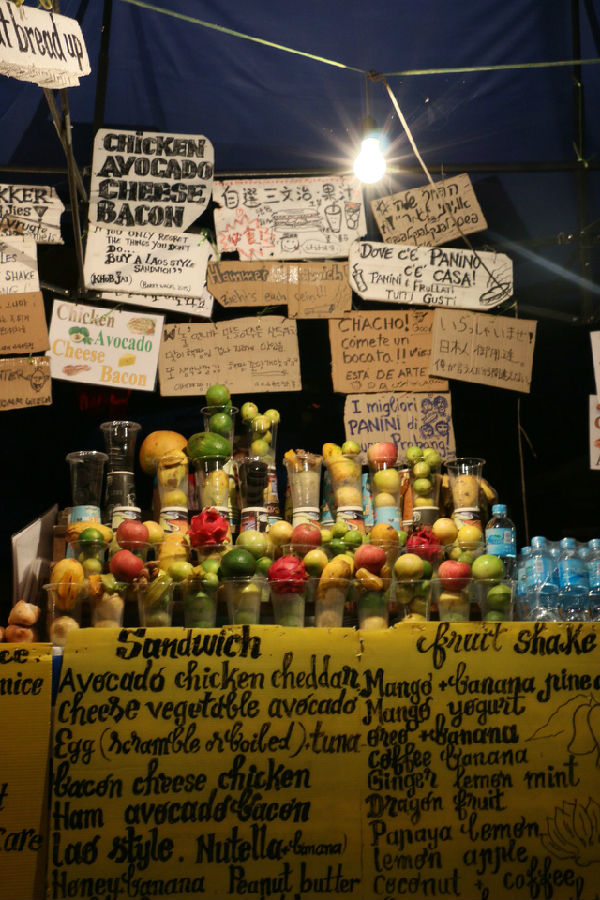 夜幕落下,我们收起画具去觅食。南洋法式的街灯发出幽暗的光,映罩出芭蕉树影影绰绰的身形,晚风扬来,带走湿热,传来一阵簌簌声。随人流涌向琅勃拉邦夜市,入眼先是一批当地风情服饰的地摊,老挝语,中文,英语招呼着来往的每一个人。挑挑看看后拐角进入美食一条街,空气中传来芒果波罗蜜、烤鱼腊肠、洋葱薄荷味......也不必什么美食攻略,看见什么中意就吃什么。与中午在餐厅用餐的体验完全不同,这时我们不是坐在高椅上的旁观者,而像一个个普通的当地人,随喜自安。