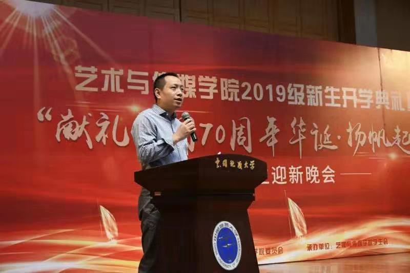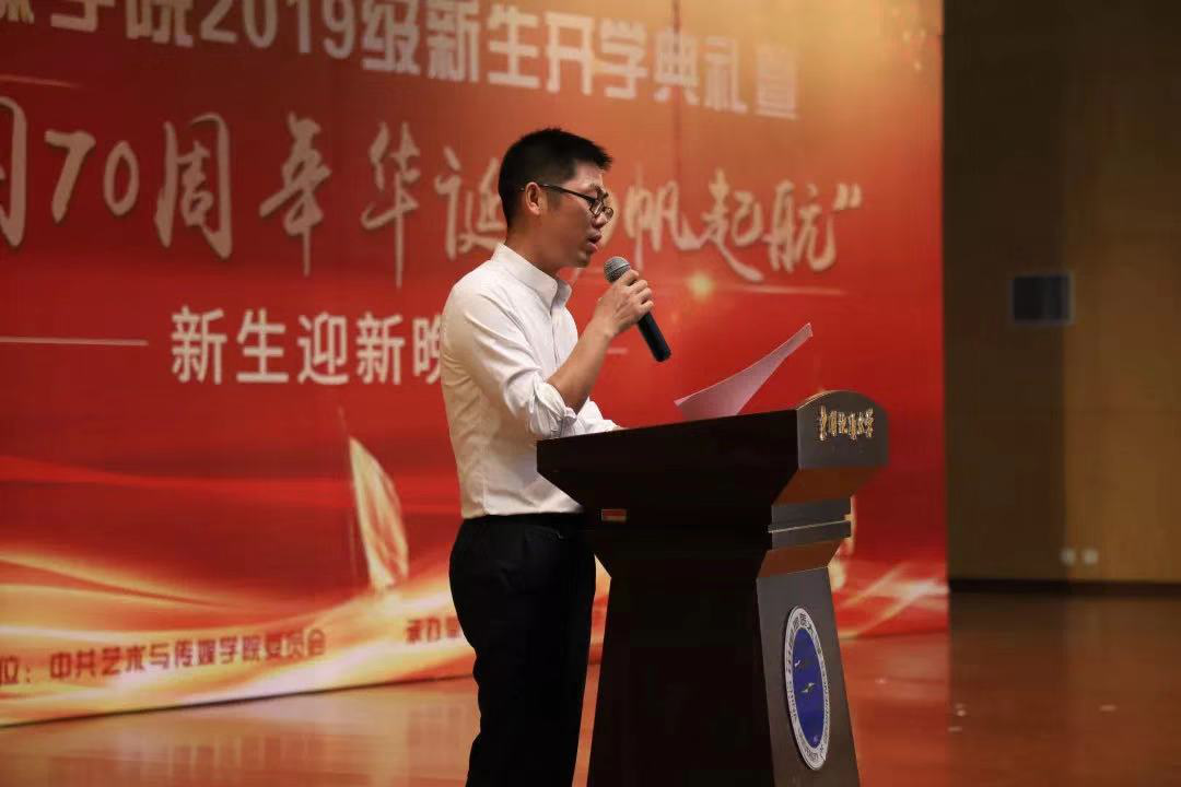 院长桂宇晖教授致辞,桂院长向大家简要阐述了学院三大学科的特点,介绍了我院音乐学,设计学,新闻传播学近几年取得的成就。桂院长谈到,每年开学典礼上的讲话都是他十分重要的时刻,他和全体老师一样,希望艺媒学子在未来都能成为伟大的音乐家、设计师、新闻传播者和科普传播专家。讲话几度被场下热烈的掌声打断。最后,桂院长引用了中国美术学院校长许江的一句话:“我们对学生既不是管,也不是不管,而是两个字——守望”,期待大家能够不断成长,把自己的青春融合在每个学习的日常。