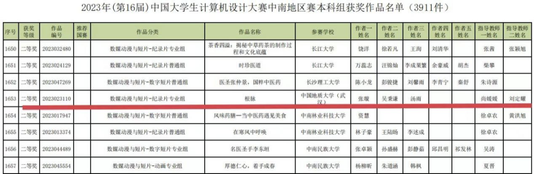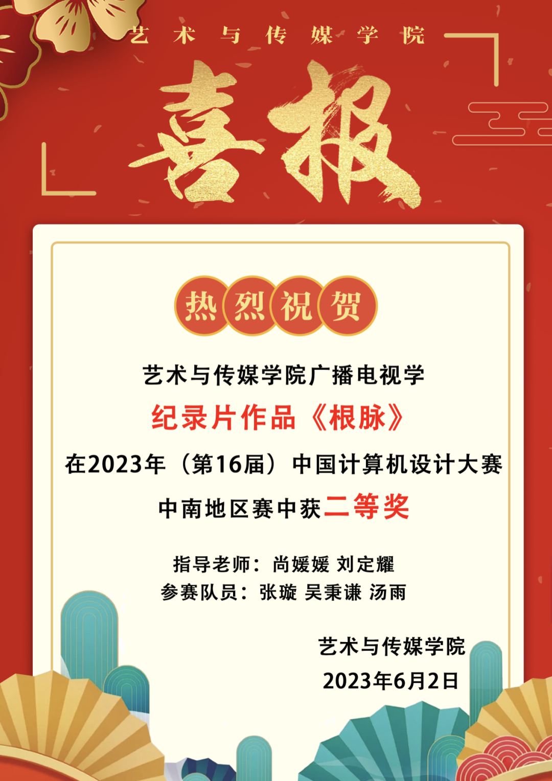 2023年5月29日,2023年(第16届)中国大学生计算机设计大赛中南赛区发布作品评审结果公告,国产成人综合网广播电视学本科生张璇、吴秉谦、汤雨创作的纪录片《根脉》(指导老师尚媛媛、刘定耀)在数媒动漫与短片-纪录片专业组类别中荣获二等奖!