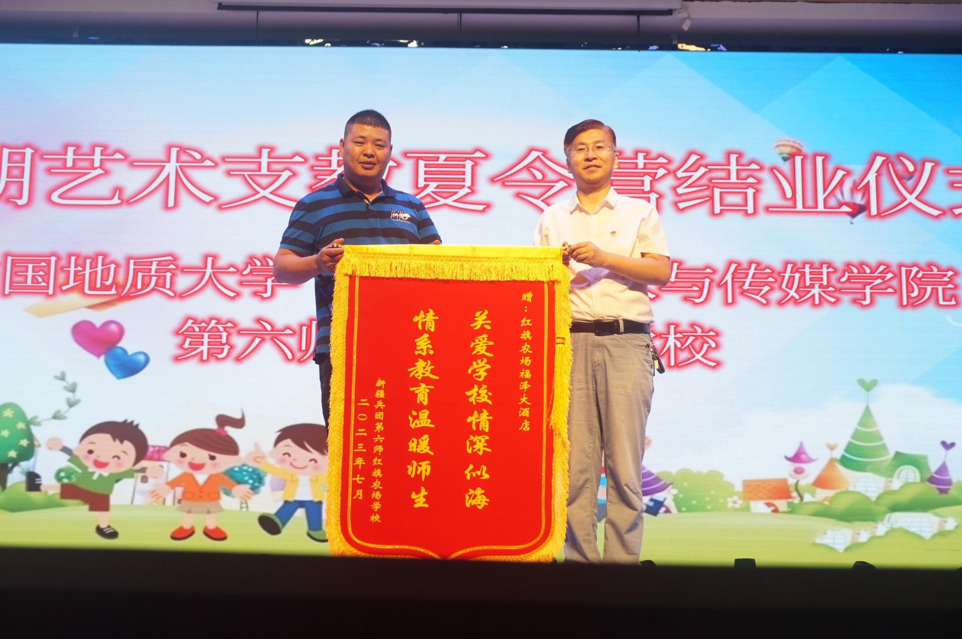 接着,红旗农场学校分别为中国地质大学(武汉)国产成人综合网以及本次活动的赞助单位福泽大酒店赠送锦旗。