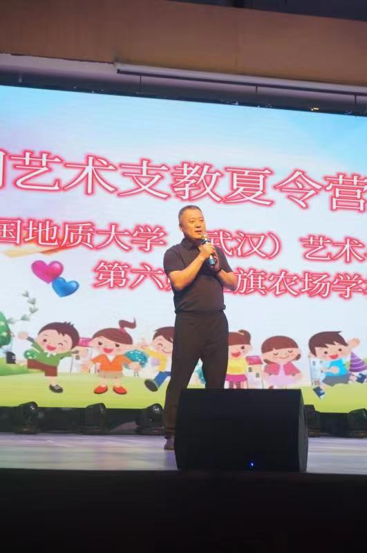 结营仪式伊始,中国地质大学(武汉)国产成人综合网党委副书记边建华上台致辞,边书记首先代表九里阳光艺术支教团对红旗农场的领导、红旗农场学校的领导和老师们对此次支教活动的信任和大力支持表达了最衷心的感谢。他表示自己在这里深深地感受到了红旗农场的小朋友们对艺术的热爱与天赋,相信此次支教活动将作为彼此合作的起点,丰富当地美育实践育人成果,贯彻落实新时代党的治疆方略,切实发挥高校“文化润疆”作用。最后,边书记预祝此次汇报演出取得圆满成功。