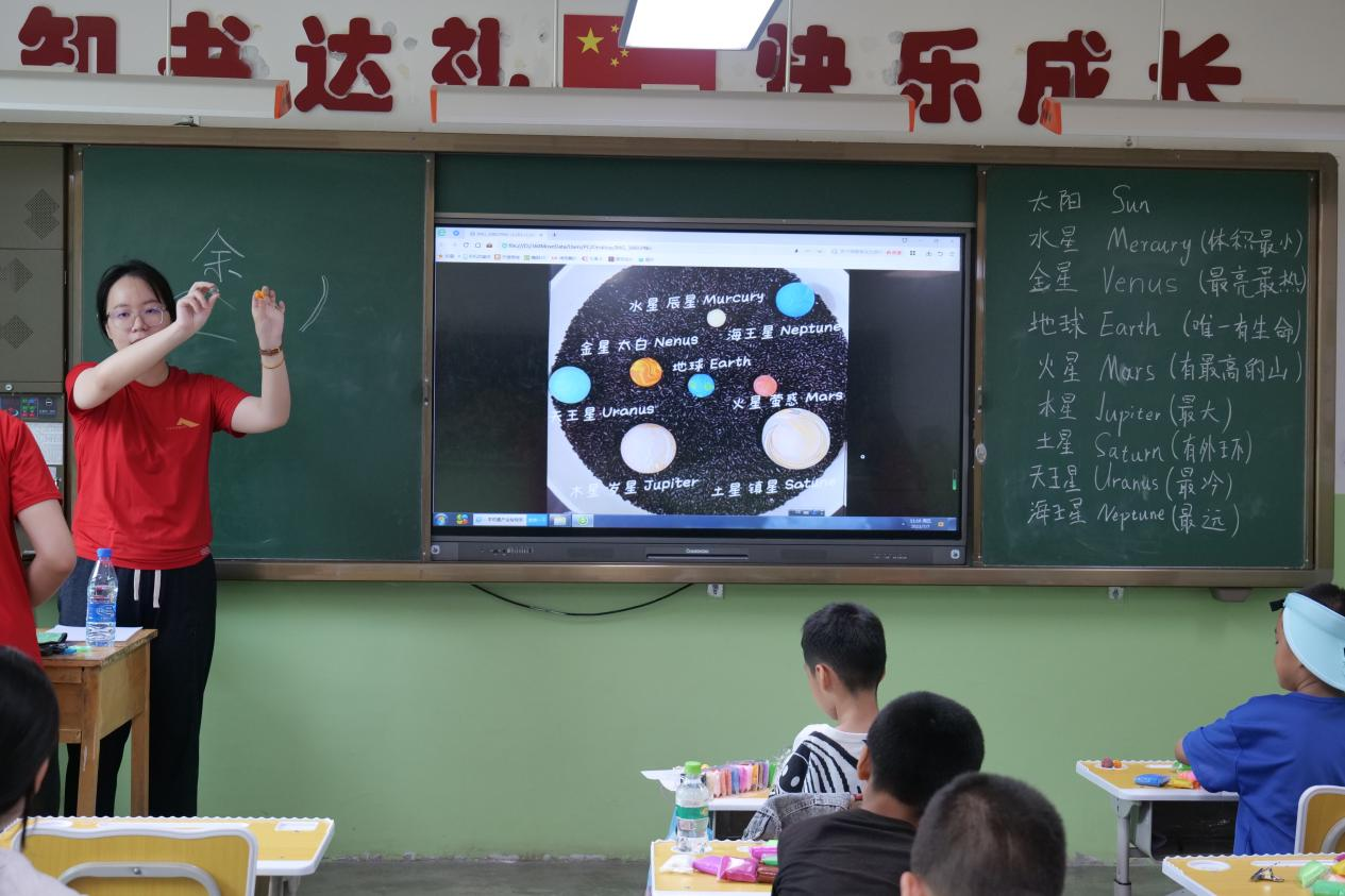 为贯彻落实习近平总书记关于教育的重要论述和关于语言文化的重要指示批示精神,深入西部地区加大国家通用语言文字的推广力度,落实新时代党的治疆方略,切实发挥高校“文化润疆”作用,在本次艺术支教的活动设计中,课程内容在“艺术+”的基础上融入了地大地质特色以及普通话教学。志愿者在课堂上为孩子们科普了太阳系的知识,带领大家用粘土制作七大行星的模型感悟宇宙与地球的奥秘,同时通过玩游戏的方式进行普通话的练习,助力当地学生普通话水平的提升,力争实现所有学段国家通用语言教学的全覆盖。