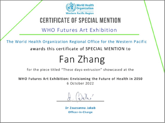 近日,世界卫生组织西太平洋区办事处(World Health Organization | Regional Office for the Western Pacific)官方网站在题为“Using art to inspire positive change for future health in the Western Pacific”的专题报道中刊发了我院张帆副教授的访谈及作品。2022年,张帆副教授作为唯一一位来自中国的艺术家参与了世卫组织西太平洋区办事处的艺术项目“WHO Futures Art Exhibition”,作为该艺术项目的组成部分,世卫组织西太平洋区办事处对张帆副教授进行了专访并于近日在专题报道中刊发了部分访谈内容。专访中张帆副教授与对方探讨了艺术家的创作;“COVID-19”对世界及人类社会的影响;如何改善解决生态环境问题;艺术对创建健康未来社会的作用以及疫情影响下艺术家个人生活状态等议题。张帆副教授的作品曾在多个国家展出并发表收录于多部国际艺术出版物,近年来欧洲多个国家的艺术杂志及网站也相继对张帆副教授进行了专访并全文刊发了访谈内容及部分作品。