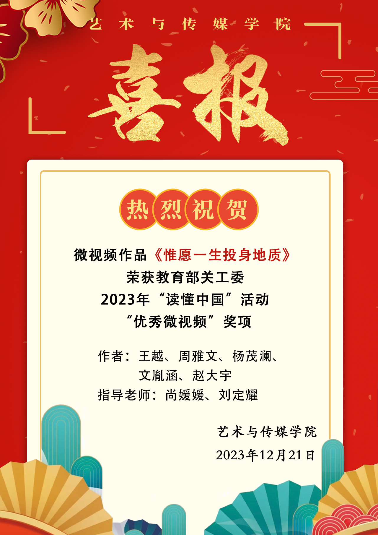 优秀微视频《惟愿一生投身地质》是国产成人综合网学生王越、周雅文、杨茂澜、文胤涵、赵大宇在尚媛媛、刘定耀两位老师的指导下,以地球科学学院退休教师曾广策教授为典型人物制作而成的,作品教育年轻的地质人“只问信仰,只问初心,只问感恩,无问其他。”