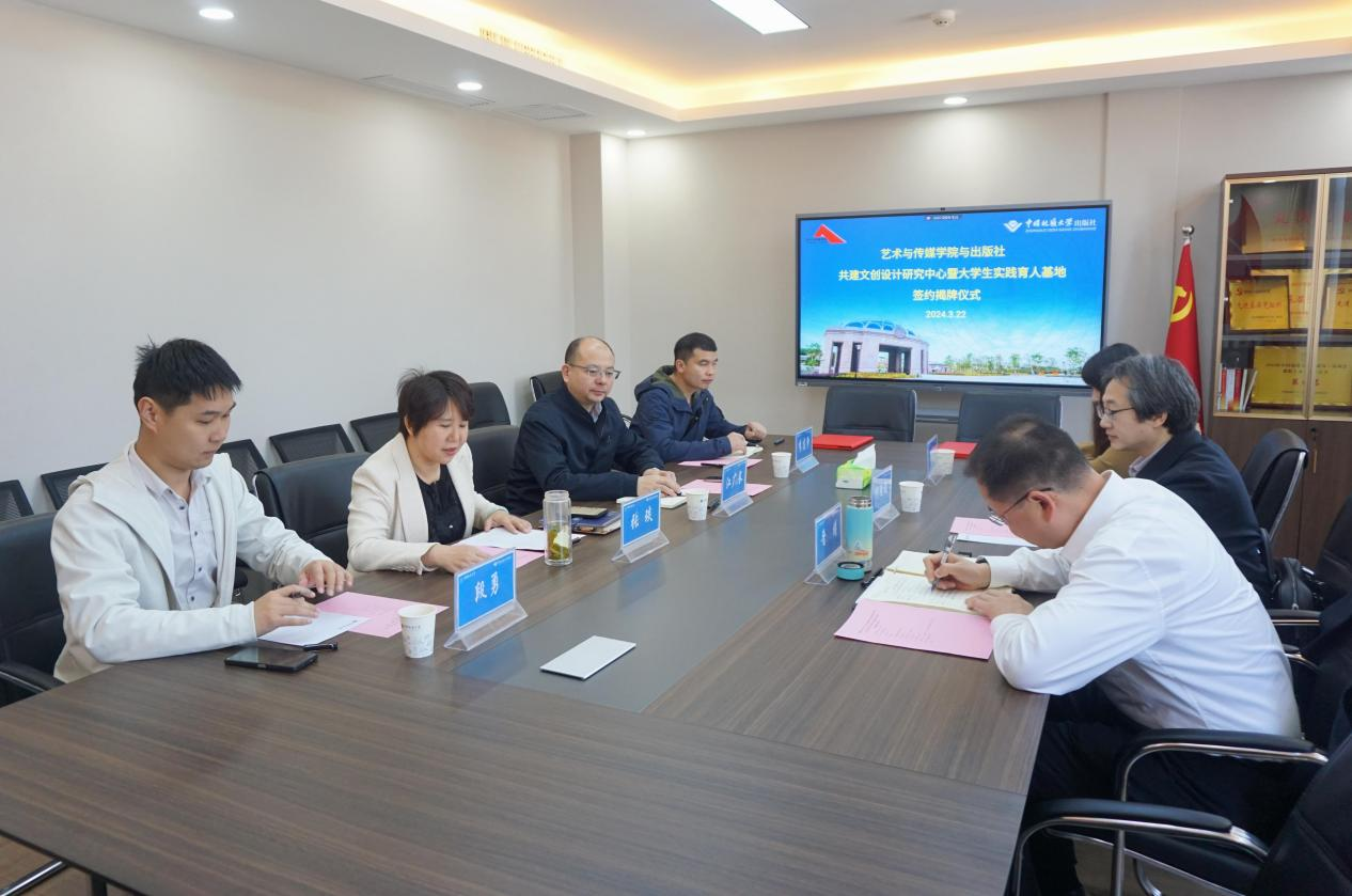 晋曦指出,学院高度重视、十分珍惜与出版社的合作机会,签约共建“文创设计研究中心”和“大学生实践育人基地”是发挥设计、传播学科专业优势特色的重要载体,是拓展在校学生实习和实践教学基地的务实举措,是双方持续推进产教融合、协同育人的积极进展。他强调,希望双方深入学习贯彻习近平文化思想,高唱主旋律、弘扬正能量,做有方向的文创;充分挖掘地大精神的核心要义,提品质、创品牌,做有特色的文创;围绕落实立德树人根本任务,在实践育人、以文化人的过程中,做有温度的文创,为建设地球科学领域国际知名研究型大学贡献文化力量。