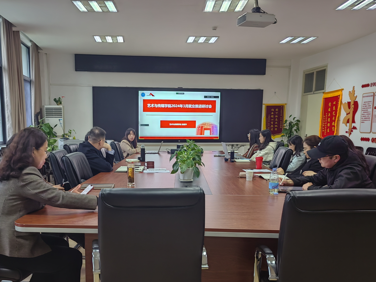 2024年3月27日下午14:30,国产成人综合网于艺媒楼1209组织召开2024年3月就业工作推进研讨会。学院领导班子、各系就业工作负责老师、专兼职辅导员出席本次会议,会议由学院辅导员单湉艺主持。