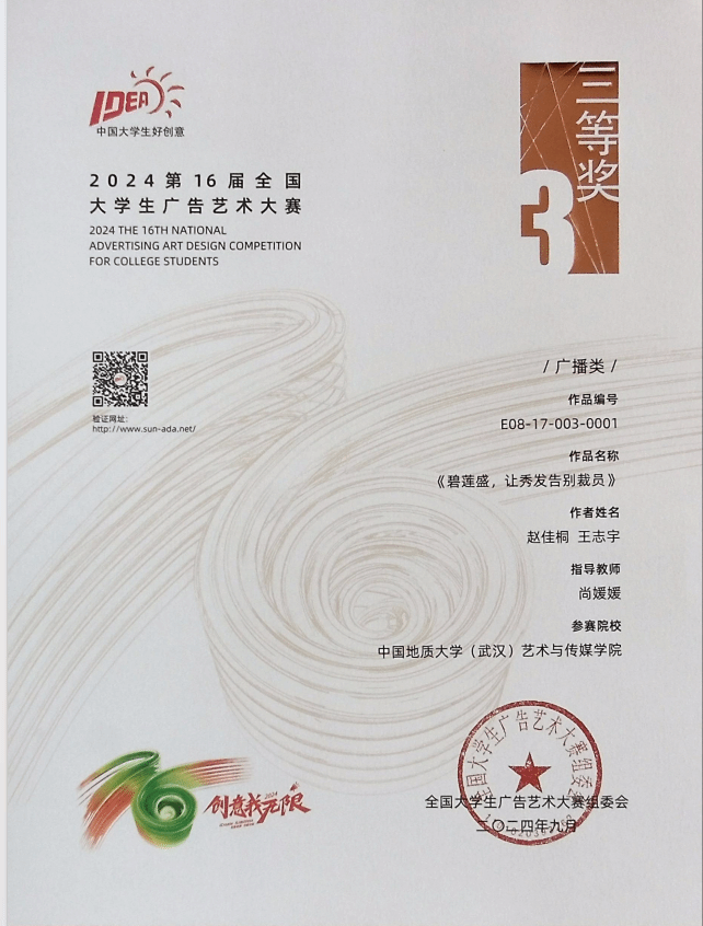 在2024年全国大学生广告艺术大赛(简称大广赛)中,由我院教师指导的参赛团队凭借卓越创意与精湛技艺,在众多高校竞争中脱颖而出,揽获2项国家三等奖,3项国家优秀奖,2项省级一等奖,5项省级三等奖,9项省级优秀奖,充分彰显我院学子创新才华。据悉,本次大赛共有全国1873所高校192万名学生参加比赛,累计参赛作品77万余件。