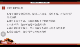 近来,新冠病毒爆发,疫情迅速蔓延,全国进入紧急状态。无论是在前线奋战的医务人员,或者是响应号召足不出户、依然尽心尽力学习和工作的普通人,都为抗疫作出应有的贡献。在本次的会议上,班主任老师们与同学们深入交流,并针对目前在家的线上学习状态进行了指导,解答了同学们在最近时间内学习和生活上提出的问题。广电专业的吴仁喜、宁薇老师强调了要充分利用在家时间,多给自己定一些规划和目标并为之努力;音乐系的班主任郭秀蓉、袁玥老师告诉了同学们在家也要时刻注意身体健康,遇到问题和困难可以随时跟老师和学校求助,充分抓紧时间跟进学习,不要荒废了学业;设计专业的廖启鹏、朱怡、杨喆、狄丞、曾健友、尹小玲老师也建议同学们在家应珍惜时间,认真学好各门课程,为以后的创作做好基础性知识的学习,并且要学会在在生活中去寻找灵感,为自己以后的设计道路做好铺垫。