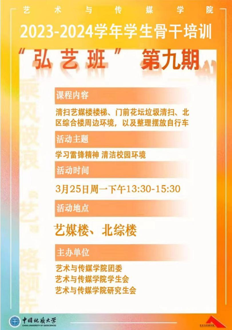 为深入贯彻落实习近平总书记关于弘扬雷锋精神的重要论述,深刻把握雷锋精神的时代内涵和实践要求,弘扬“奉献、友爱、互助、进步”的志愿精神,3月25日,国产成人综合网组织学生骨干和学生志愿者开展了2023-2024学年第九期学生骨干培训“弘艺班”暨“学雷锋志愿服务月,清洁校园志愿行”志愿服务活动,引导同学们形成助人为乐、艰苦朴素的思想道德品质。