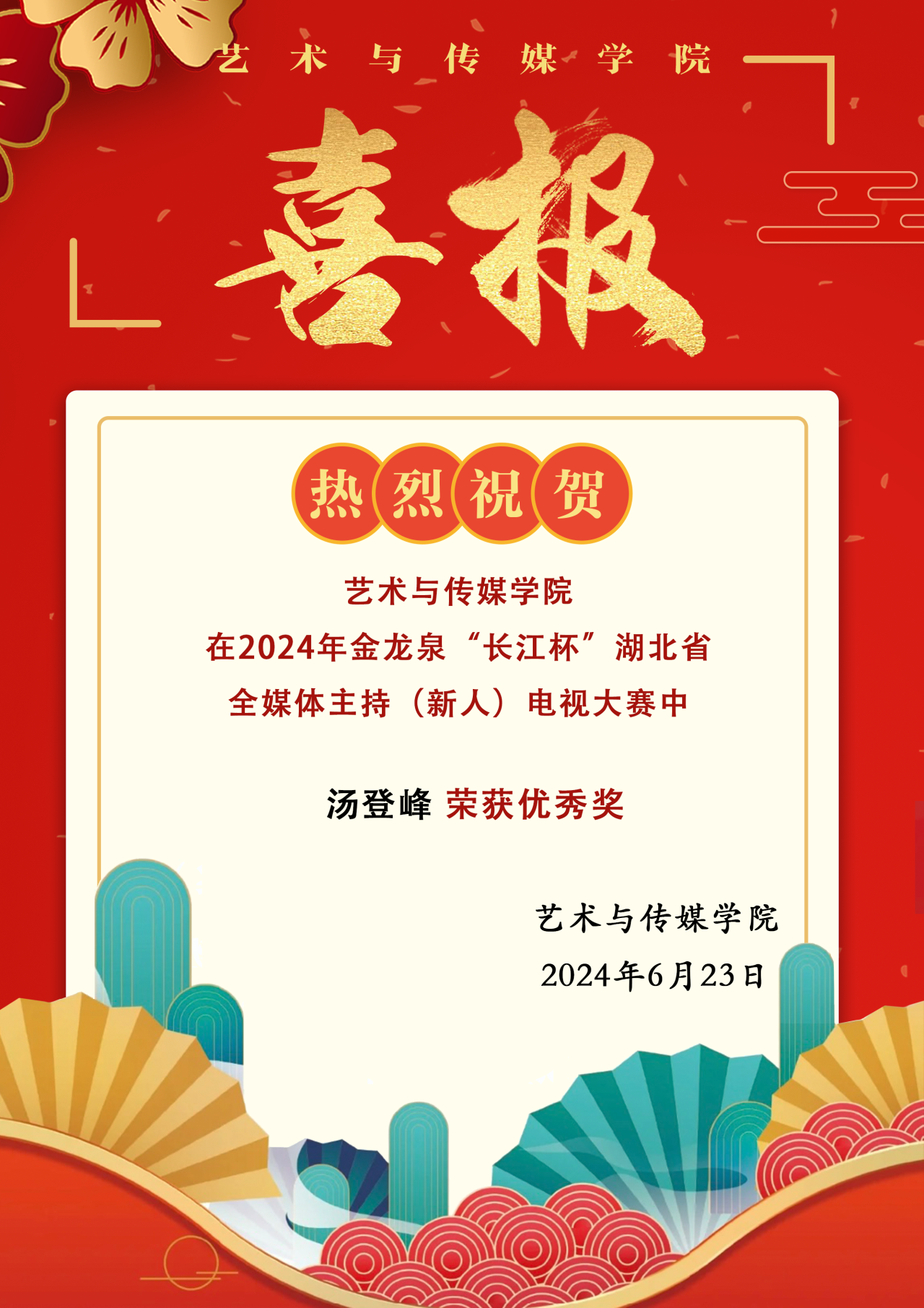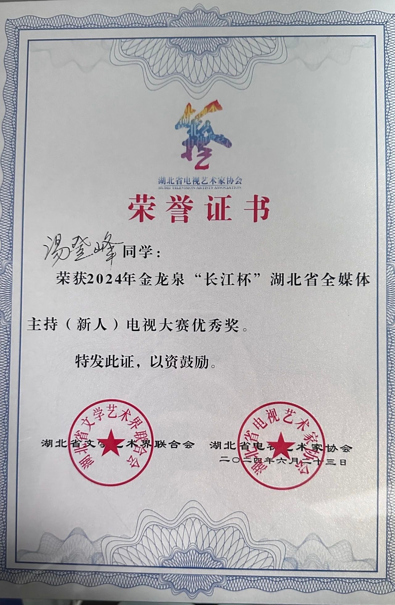 喜报!我院汤登峰同学在2024年金龙泉“长江杯”湖北省全媒体主持(新人)电视大赛中荣获优秀奖!