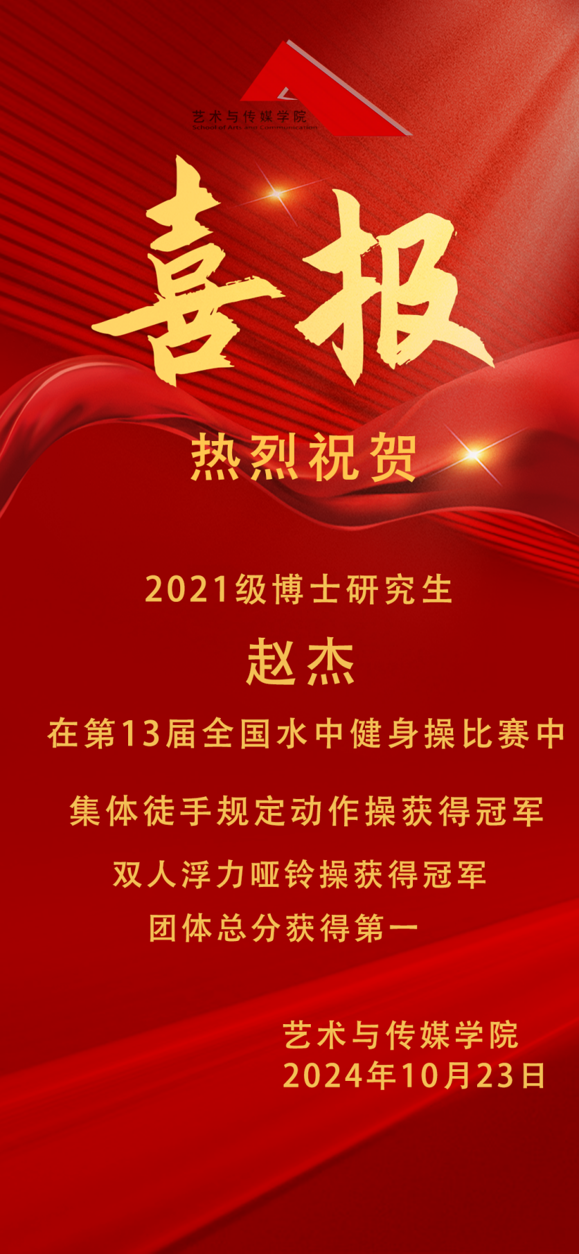 2024年10月19日至20日,第13届全国水中健身操比赛在安徽省马鞍山市奥体中心游泳馆举行。在此次水中健身操比赛中,中国地质大学(武汉)代表队共13人参赛,并斩获佳绩。我院21级博士研究生赵杰获得集体徒手规定动作操冠军、双人浮力哑铃操冠军以及团体总分第一的优异成绩。