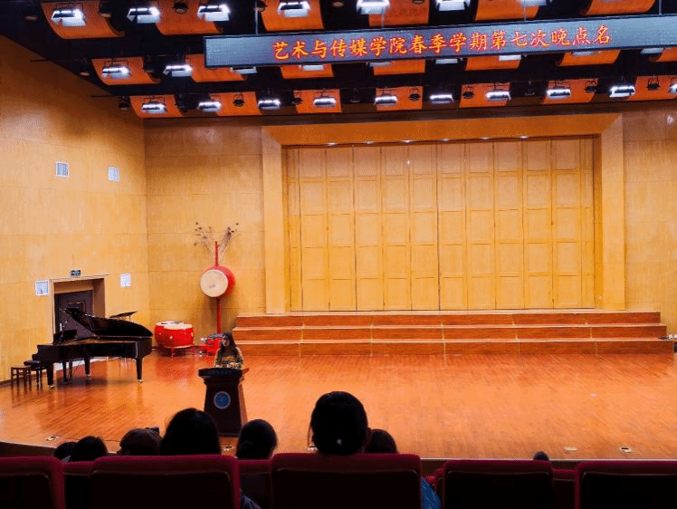2025 年 3 月 31 日晚,国产成人综合网在音乐厅组织开展春季学期第七次晚点名活动。本次活动围绕保研经验分享、早操荣誉表彰、日常管理规范三方面内容展开,学工组辅导员曾戈晖、兼职辅导员吴健以及全体2024级本科生参加本次活动,视觉传达设计专业 2021 级优秀学生李怡雯受邀担任分享嘉宾。
