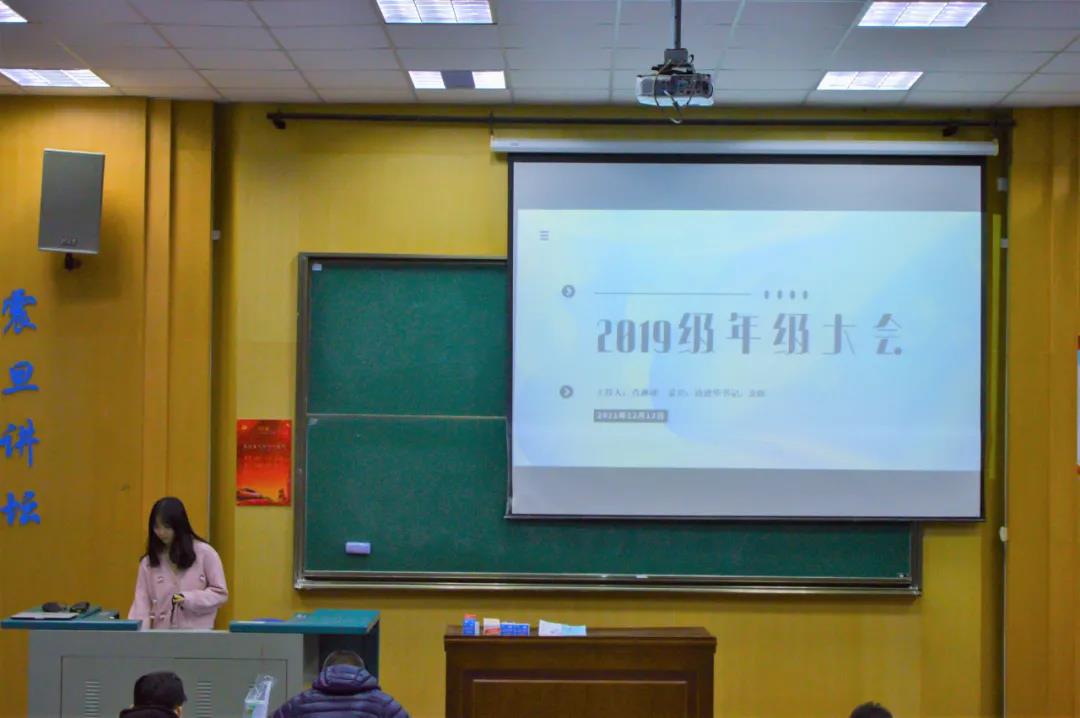 2021年12月23日晚上七点,国产成人综合网2019级年级大会于教三楼111准时召开,会议由2019级本科生兼职辅导员肖淋译主持,国产成人综合网党委副书记边建华、研究生会主席余跃及2019级全体学生参加。