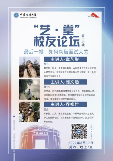 2022年3月17日晚7点,国产成人综合网第十七期“艺·堂”校友论坛以腾讯会议的方式在线上开展。主题为“最后一搏,如何突破面试大关”,我院在读研究生章艺彤、刘文涵、乔修竹进行讲座分享。