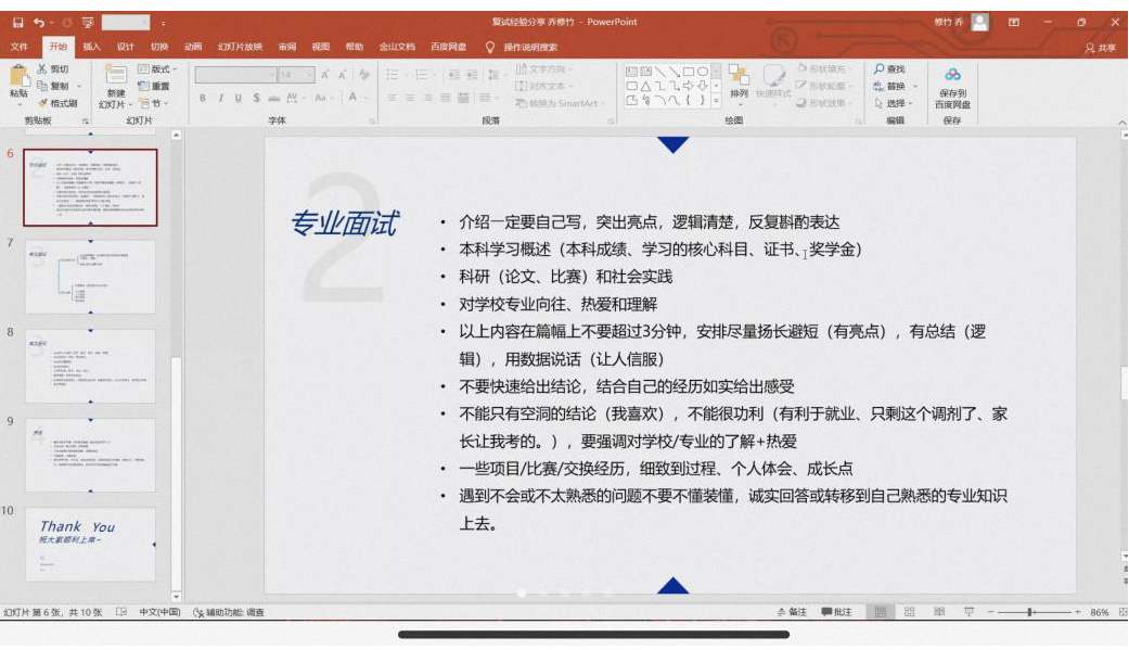 章艺彤目前就读于信息与交互设计专业,讲座分享中,她提醒大家英语口语需要提前准备,要充分利用网络资源提前准备面试问题等来提高英语面试的能力。刘文涵根据今年新闻传播学考研的情况建议同学们要完善个人简历、突出自身闪光点;着装整洁大方、充满朝气;心态方面要保持谦逊诚恳。乔修竹根据自身的经历建议大家进行自我介绍时要贴合实际、逻辑清楚;介绍时长一般控制在三分钟左右。交流环节中三位分享的同学耐心回答了学弟学妹提出的问题并衷心祝愿大家顺利上岸。