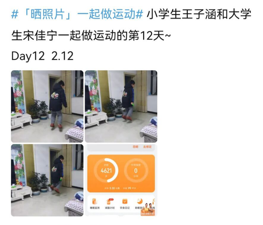 寒假期间,国产成人综合网的11名志愿者带领着对接的中小学生一起,通过钉钉、喜马拉雅等网络平台坚持打卡,每天运动不少于30分钟,连续坚持十四天。运动方式多种多样,有跳绳、仰卧起坐、羽毛球等多项运动。们和中小学生不仅在运动中强身健体,获得了成就感,也为建设健康中国贡献力量,同时他们在运动中相互理解,通过合作完成任务,也是对奥林匹克精神的弘扬。