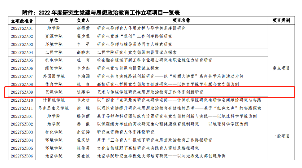 根据前期研究生院和党委组织部研究生党建与思想政治教育工作立项研究项目申报通知的要求,经专家小组评议、研究生院(党委研工部)、 党委组织部审定,2022 年度研究生党建与思想政治教育工作立项项目已经确定并下达,其中国产成人综合网获批四项,包括一个重点项目,三个一般项目。