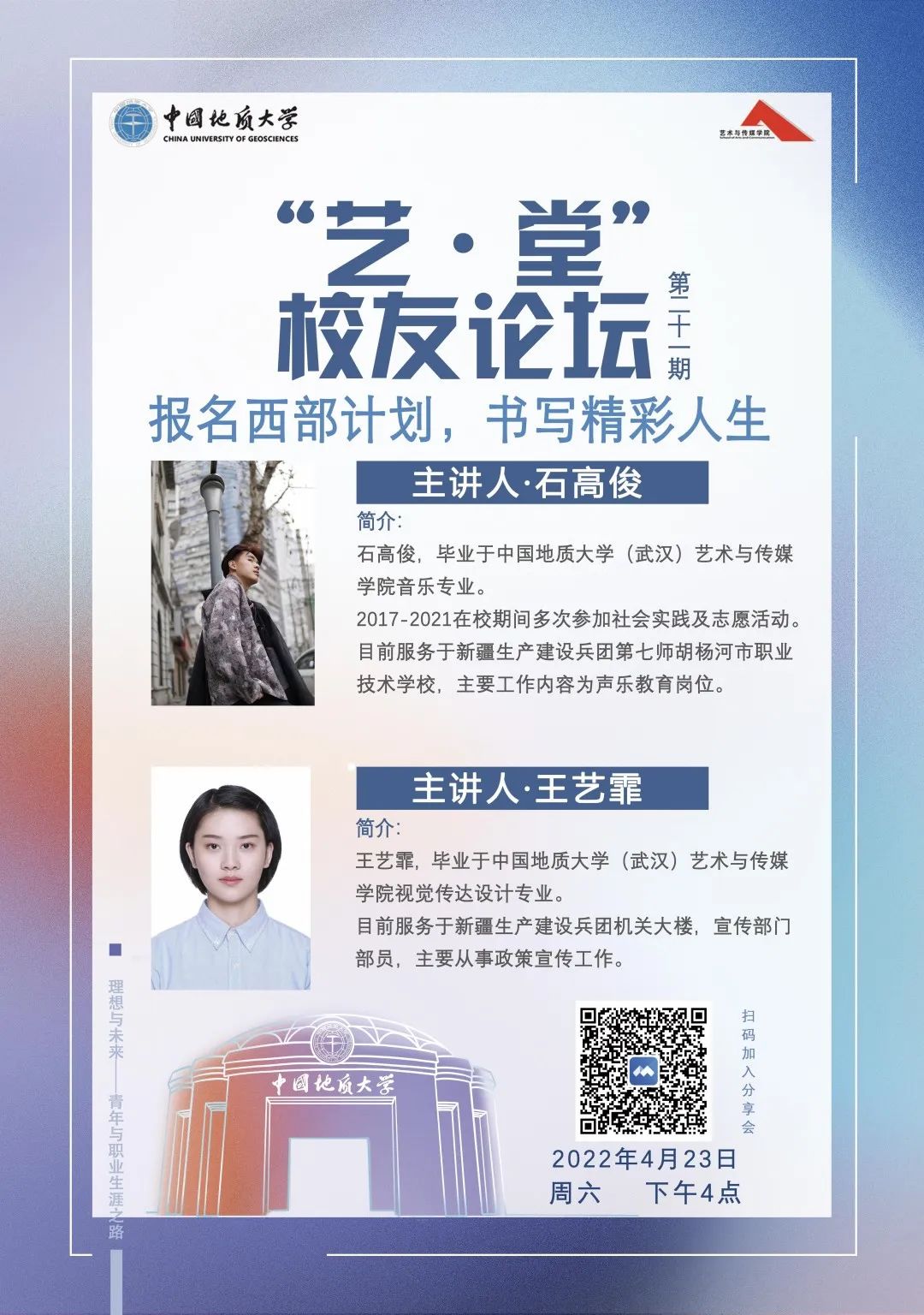 4月23日下午4:30,国产成人综合网第二十一期“艺·堂”校友论坛“报名西部计划,书写精彩人生”讲座活动顺利进行,由我院音乐专业毕业生石高俊和视觉传达设计专业毕业生王艺霏主讲。