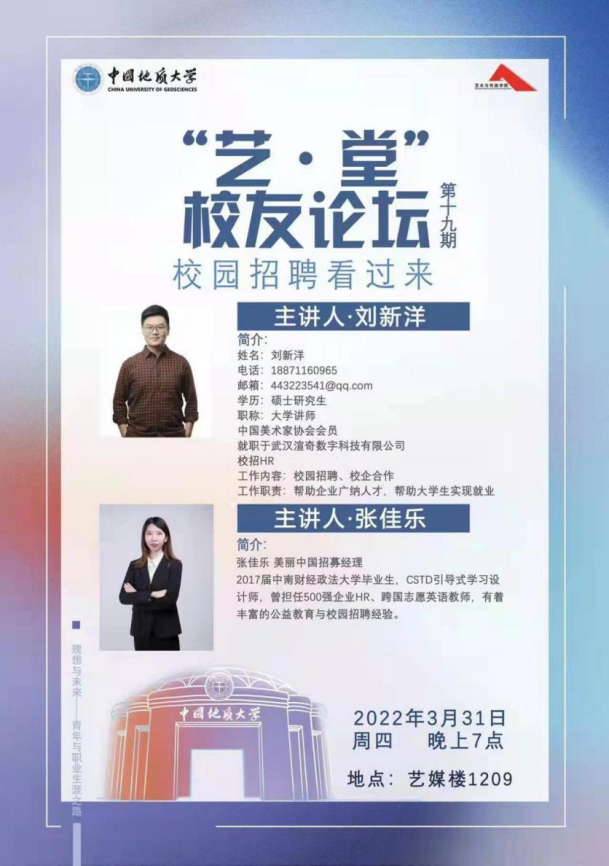 大学是教书育人的象牙塔,但求职就业不能闭门造车,学生需要深入行业一线了解工作氛围,需要获取行业资讯知晓工作重点。对此,我院积极与二十多家用人单位开展联络,深耕艺·堂校友论坛平台,邀请企业HR、资深职员进行就业宣讲。本学期已成功举办4期,系列论坛主题包含考研复试分享、出国留学宣讲、辅导员备考座谈会、支教项目宣讲、游戏公司招聘等,为学生带来了有趣味、有启迪、有深度的课堂讲座。