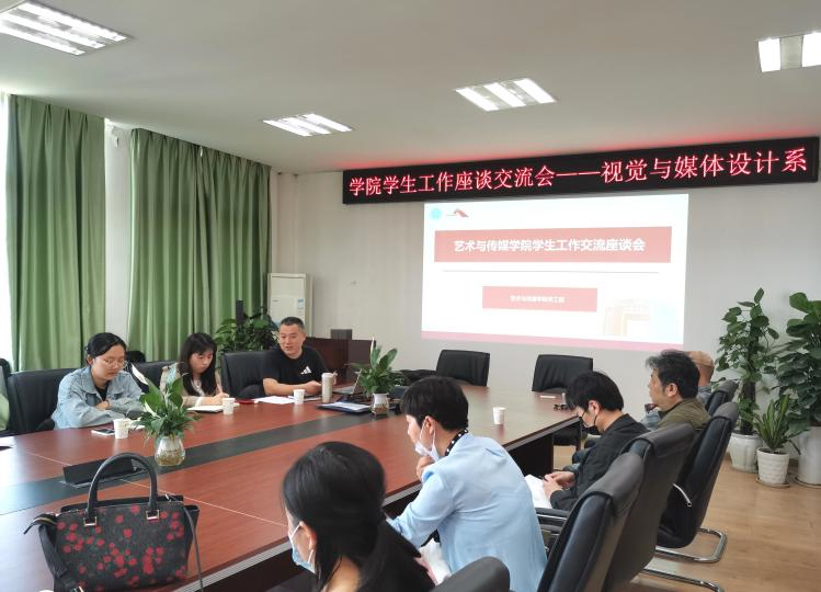 (通讯员 杨彬彬)4月21日下午2:30,国产成人综合网学生工作座谈交流会(视觉与媒体设计系)在艺媒楼1209会议室召开。学院副院长杨喆、党委副书记边建华、视觉与媒体设计系全体领导班子、班主任老师、学工组辅导员单湉艺和曾戈晖参加了座谈会。党委副书记边建华主持会议。
