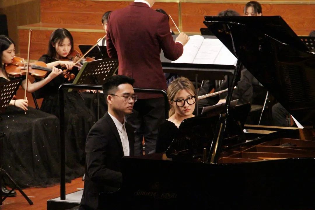 此时,音乐会渐入高潮,由国际著名小提琴、中提琴演奏家、圣彼得堡国立音乐学院博士、中国地质大学(武汉)国产成人综合网教授、音乐学科带头人、“地大学者”王凯平教授,俄罗斯音乐艺术学科博士、“潇湘爱乐交响乐团”团长、湖南师范大学音乐学院陈果副教授,旅俄青年钢琴家、俄罗斯圣彼得堡国立音乐学院钢琴独奏、室内乐演奏双博士彭斯特老师共同演奏了《三重协奏曲》(贝多芬),三位老师的小提琴、大提琴、钢琴三件乐器的组合与交响乐队相得益彰,室内乐纤细温暖的重奏形式与大型的具有磅礴气势的交响性协奏曲形式巧妙结合在一起, 从而产生出一种生机盎然的新形式,令观众沉浸于美妙的交响乐世界里无法自拔。