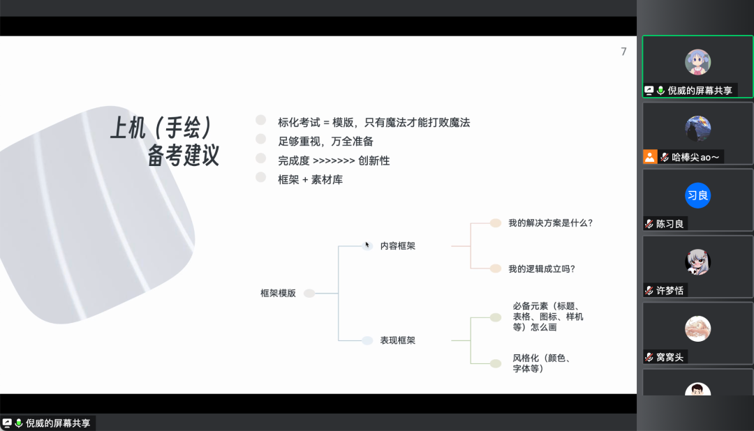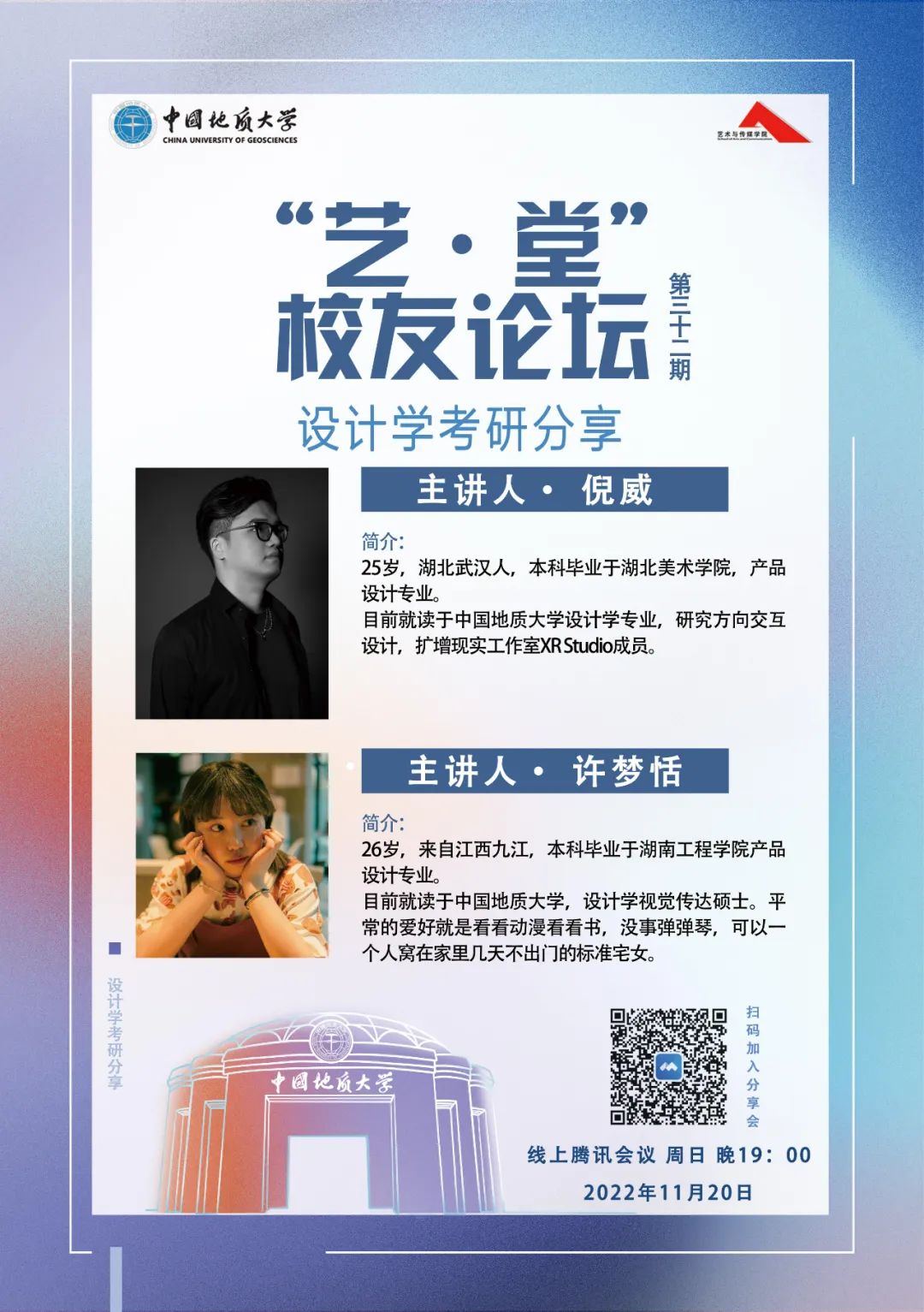 11月20日晚19:00,国产成人综合网于线上举办了第三十二期“艺·堂”校友论坛——“设计学考研分享”讲座。本次分享会邀请了2022级设计学研究生班的倪威、许梦恬两位同学作为主讲人分享、交流考研经验,大三、大四部分学生线上参会。