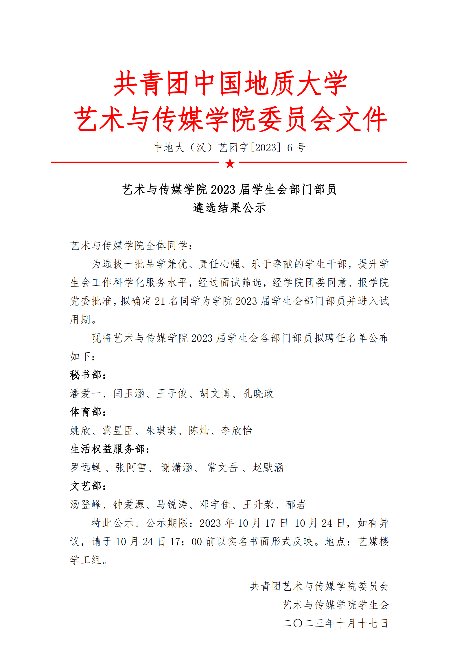 通知 | 国产成人综合网2023届学生会部门部员遴选结果公示