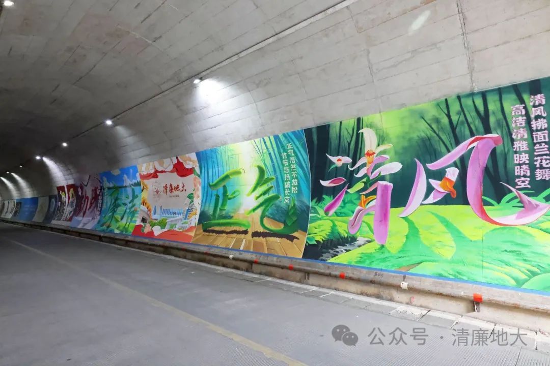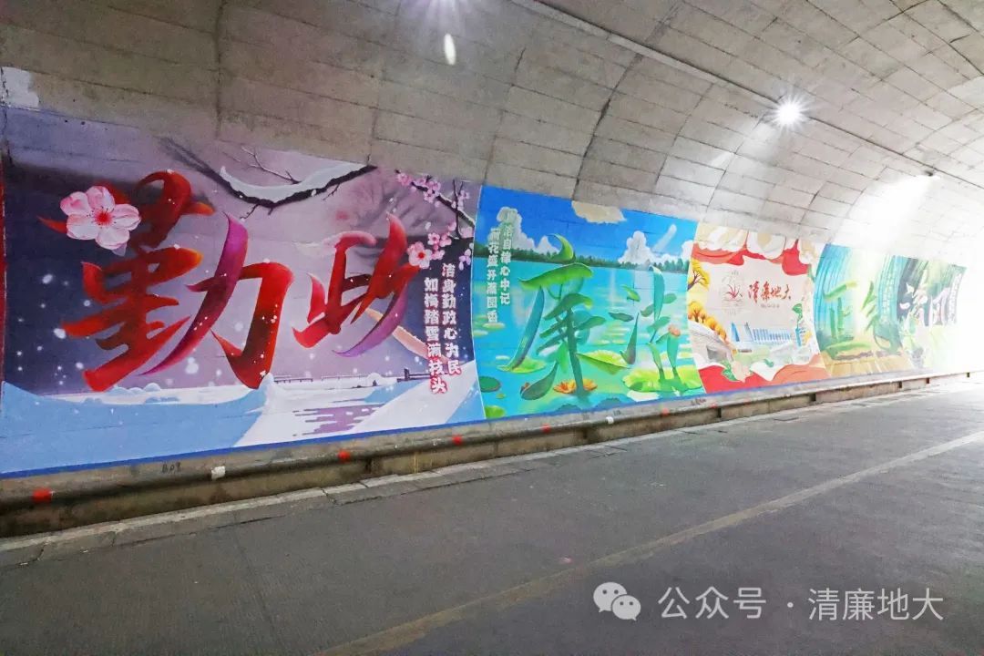 在美丽的校园里,连通西区和北区校园的地大隧道是不少师生课间往返的必经之路。最近,有这样几幅壁画令人眼前一亮:以梅花、荷花、兰花和竹子为意象,组成的“勤政”“廉洁”“清风”“正气”四幅画,围绕在“清廉地大”主图的周围,色彩鲜明,寓意深刻。壁画长22米,高3米,由我校国产成人综合网2007级校友王龙设计。壁画通过艺术文字变形和AIGC的手法,形象地宣传了地大人“艰苦朴素、求真务实、奉公守法、清正廉洁”的精神品质,以画喻“廉”、以“廉”治“心”,让校园廉洁文化有了更为生动的艺术再现。